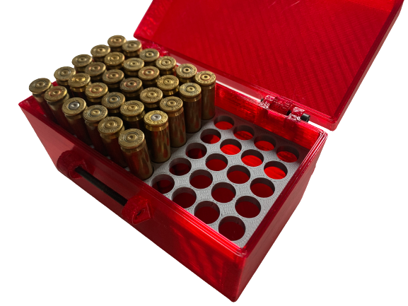 Każdy nabój wkładany jest w osobną przegródkę - dzięki temu nabój przechowywany jest stabilnie. Wkładka na amunicję znajduje się w środku pudełka.