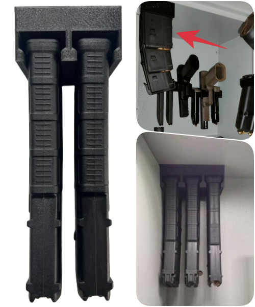 Uchwyty / wieszaki pomieszczą/utrzymają także w pełni naładowane magazynki i broń. Wszystkie wymiary są dokładnie przemyślane aby utrzymać magazynki / broń stabilnie. Uchwyty wykonane są z bardzo wytrzymałego tworzywa.