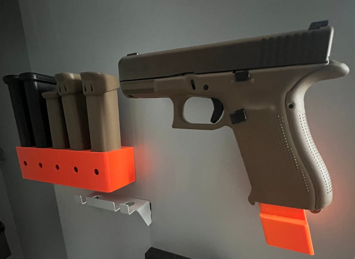Uchwyty / wieszaki pomieszczą/utrzymają także w pełni naładowane magazynki i broń. Wszystkie wymiary są dokładnie przemyślane aby utrzymać magazynki / broń stabilnie. Uchwyty wykonane są z bardzo wytrzymałego tworzywa.